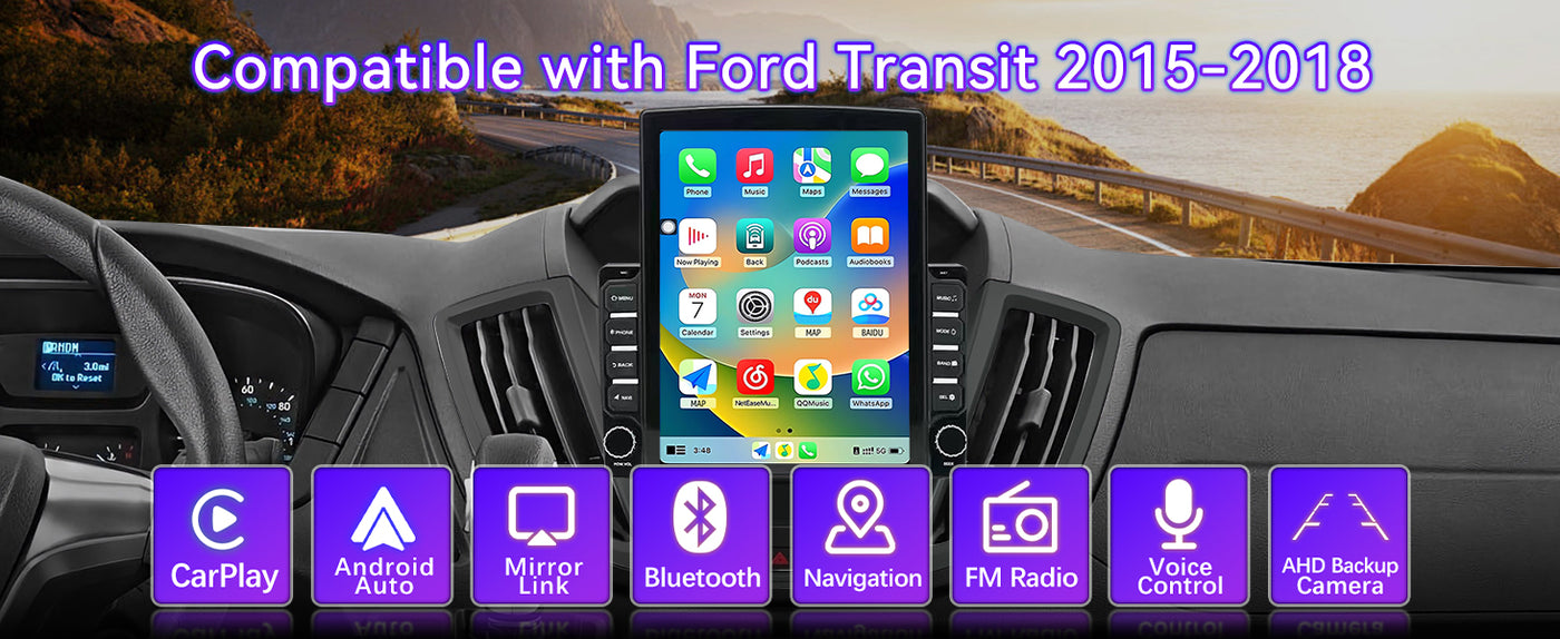 - 【Car Stereo with Wireless Carplay & Android Auto】This car radio is compatible with Ford Transit 2015 2016 2017 2018 without small screen, supports wireless Carplay/Android auto /Mirrorlink. Wirelessly connect your phone to the car's stereo infotainment system, providing a seamless experience. You can make phone calls, send messages, listen to music, and get directions using voice control, allowing you to focus on driving without worrying about using your phone, making your driving safely