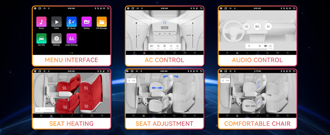 - 【Multi-function with Rear AC Control/Seat Heating/Fan Speed】This rear touchscreen integrates seamlessly with your original car's infotainment system and not only provides entertainment for rear seat passengers but also allows them to control various aspects of the car, such as AC control, rear seat temperature, seat heaters, audio volume control, the passenger' s seat control and even control the fan speed without distracting the driver.