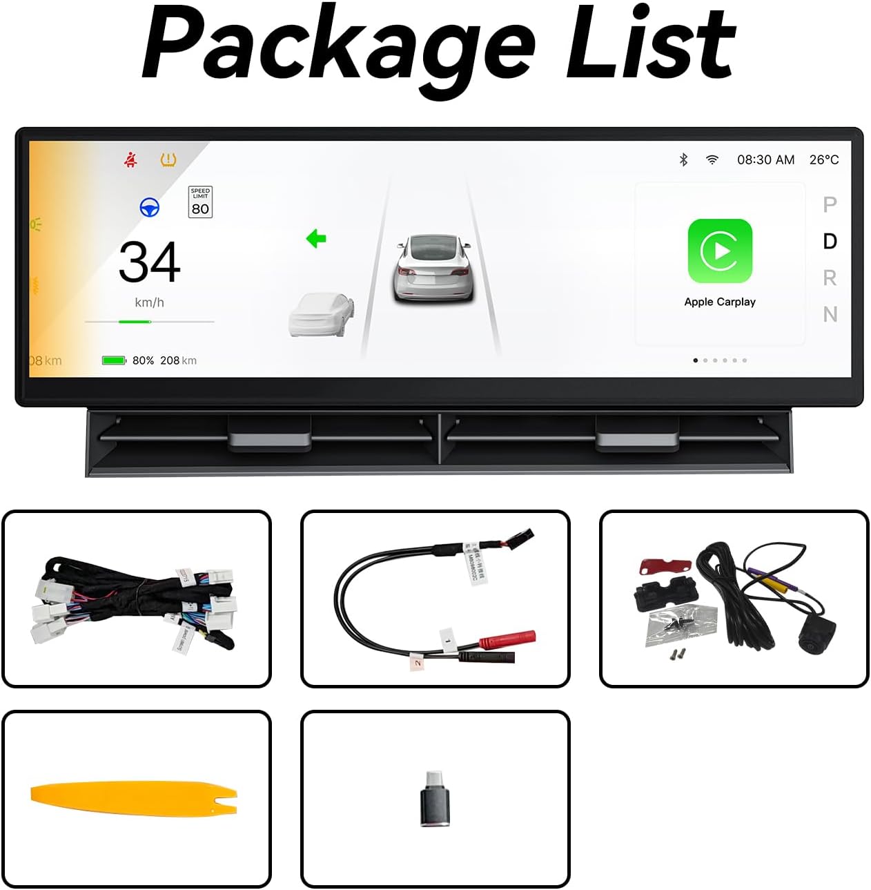 - 【Blind Spot Monitoring&Safety Warning】 It also provides safety alert reminders, such as real-time display sync, blind spot warnings, SWC control, wireless connectivity, displays speed, gear, tire pressure, battery status, autopilot ,seat adjustments, and volume control, keeping your focus on the road. Comes with a 1080P Front Camera for your safety and parking